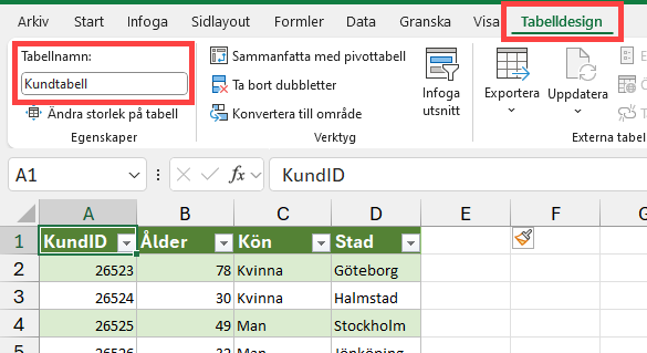 Först säkerställer du att originalvärden är definierade som en Exceltabell. Kortkommandot är Ctrl + T. Därefter ger du tabellen ett passande namn. Det gör arbetet enklare senare.