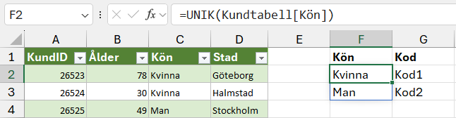 =”Kod”&SEQUENCE(ANTALV(UNIK(Kundtabell[Kön])))