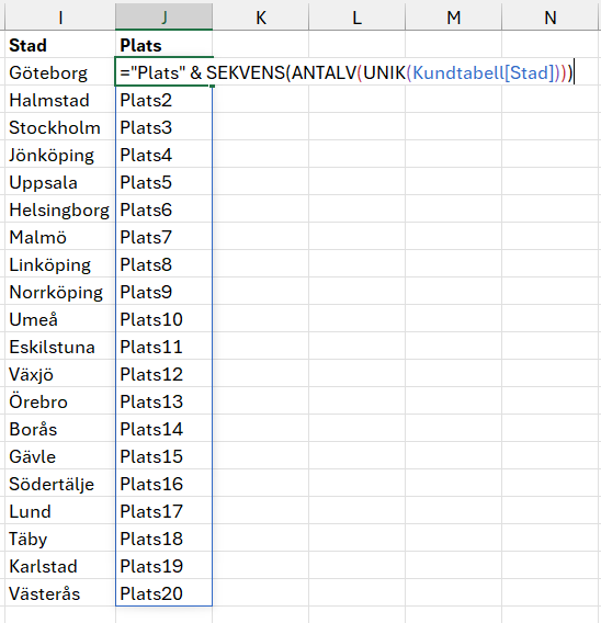 =”Plats” & SEQUENCE(ANTALV(UNIK(Kundtabell[Stad])))