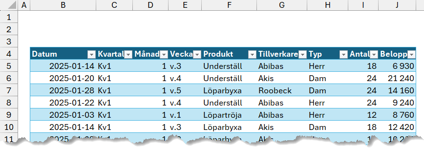 Vi har en källtabell i Excel (går givetvis bra att ansluta mot andra filer och databaser) med 1908 rader data som sträcker sig för perioden 2025-01-01 till 2026-12-31.