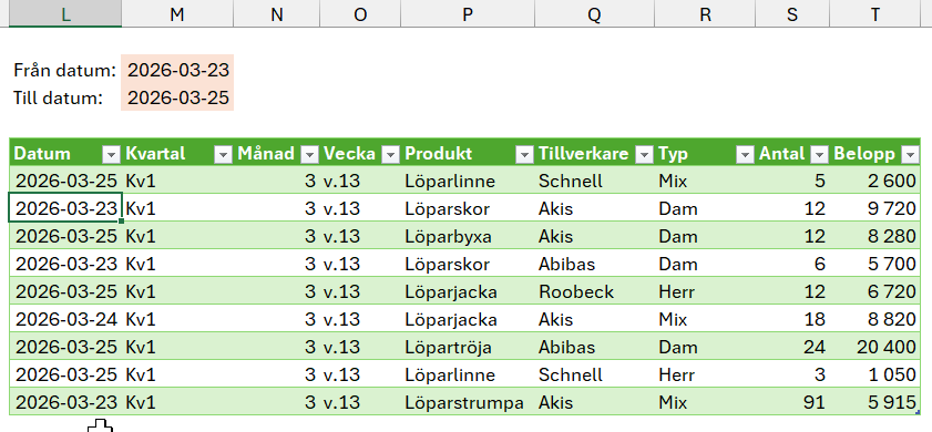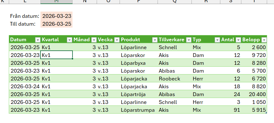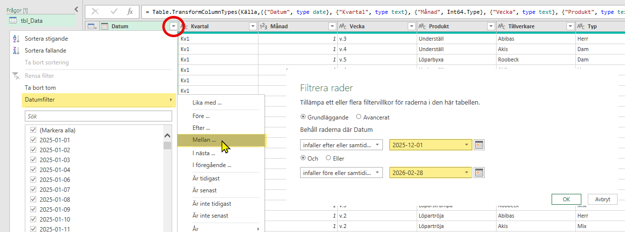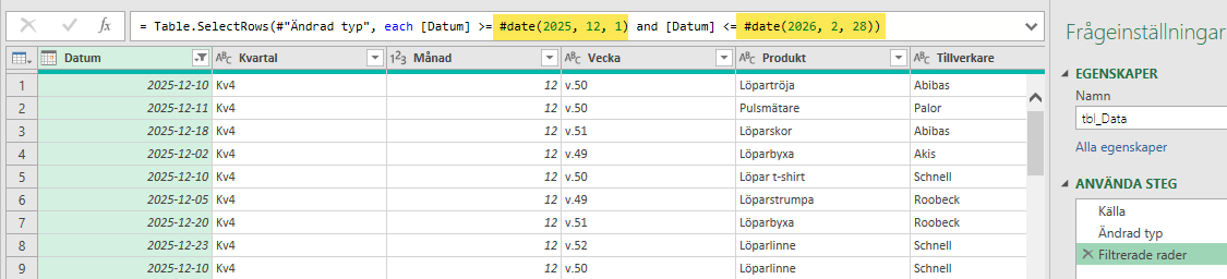 Den filtrerade tabellen innehåller nu endast data från 2025-12-01 till 2026-02-28. För att ändra datumintervall behöver i detta läge nu först öppna frågan i Power Query, gå till rätt frågesteg och ändra datum på två ställen. Detta är dels många klick och filens användare ska inte behöva ha koll på hur man gör dessa steg i Excel.