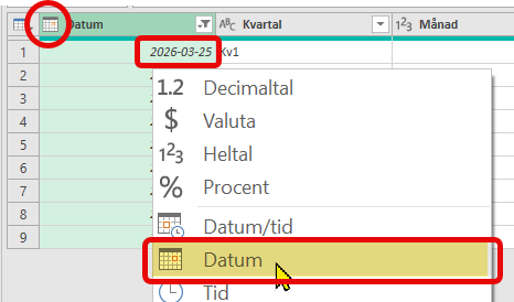Dubbelkolla att datatypen är Datum (2025-12-01) . Skulle det vara Datum/tid (2025-12-01 00:00:00), så ändra till Datum.