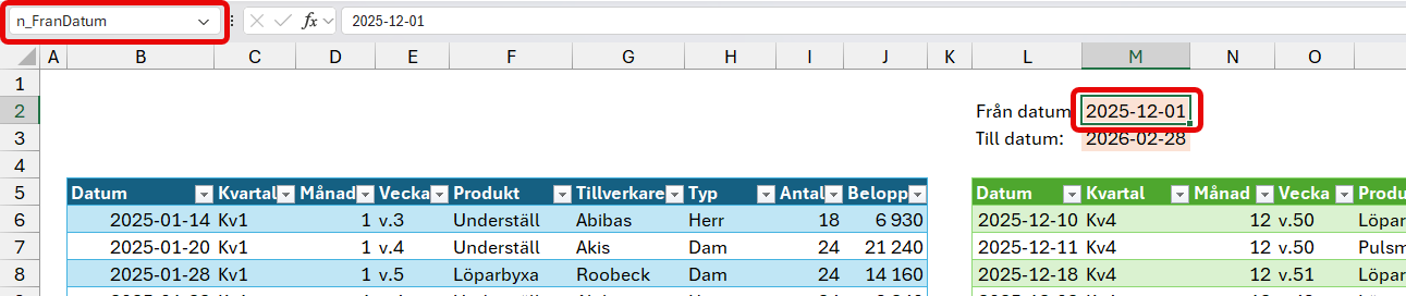 De cellvärden som nu existerar i cell M2 och M3 är nu svaret på frågorna n_FranDatum och n_TillDatum i Power Query.