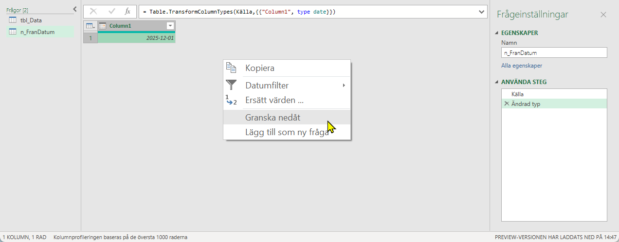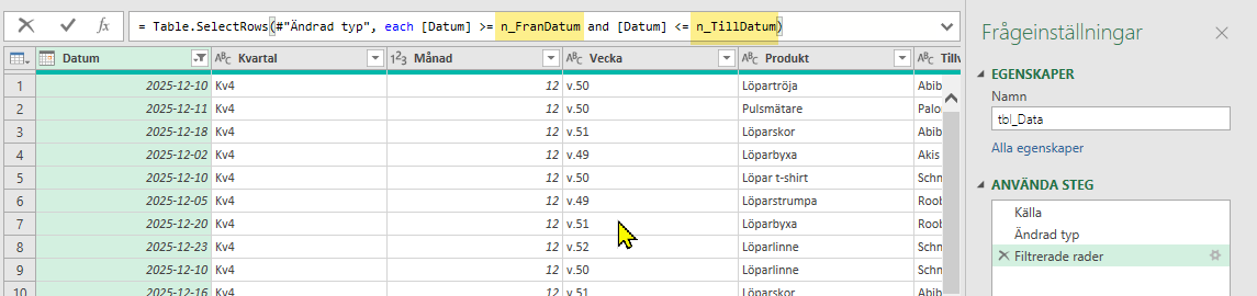 Sista steget är att ersätta de hårdkodade filtrerade värdena som vi skapade initialt i första frågan tbl_Data. Markera sista frågesteget (Filtrerade rader) och byt ut till n_FranDatum och n_TillDatum. Klicka på Stäng och läs in. Nu har du skapat ett dynamiskt datumfilter 🥳🤩