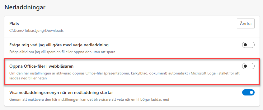 För att i stället öppna filen i programmet måste du ändra på en inställning i Edge.