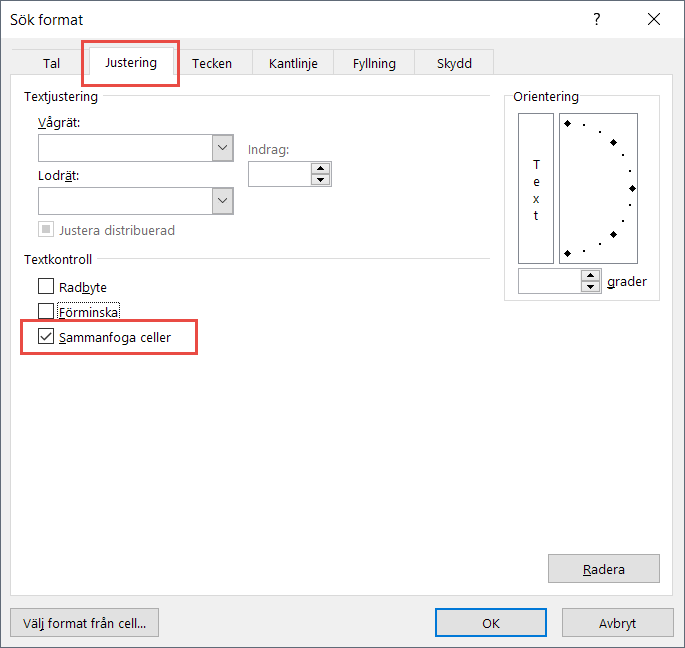 - I nästa dialogruta, välj fliken Justering (Alignment) och bocka sedan för Sammanfoga celler (Merge cells) lite längre ner i dialogrutan. Klicka OK