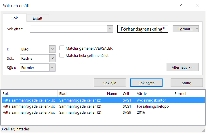- Tillbaka till Sök-dialogrutan, klicka på Sök alla-knappen. Nu visas alla sammanfogade celler i en lista. Klicka på respektive rad för att markera den sammanfogade cellen