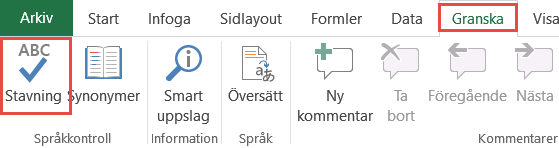 - På fliken Granska (Review), klicka på knappen Stavning (Spelling). Eller kortkommandot F7
