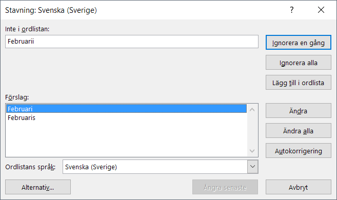 - Stavningskontrollen drar igång och stannar på första ordet som inte finns i den inbyggda ordlistan. Man kan nu skriva in ett nytt ord (rättstavat) och klicka på knappen Ändra. Eller så finns det olika alternativ man kan välja med övriga knapparna till höger i dialogrutan