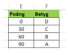 Nästa steg blir att skapa en hjälptabell där vi själva kan bestämma betygsgränserna och vad som ska synas för varje betygsgräns. Det kan vara text, siffror eller precis vad som helst.
