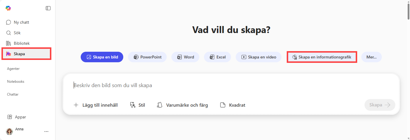 - Gå till menyvalet Skapa i Copilot Chat, i den vänstra panelen.